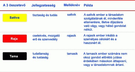 Azonkivül érdemes tudni, hogy a Teremtés alapkövei a sattva, raja és tama, három finomrezgésű alkotóelem, megnyilvánul minden földi dologban is. Minden élő és élettelen, megfogható és megfoghatatlan dolgot ezek a rezgések hatnak át!