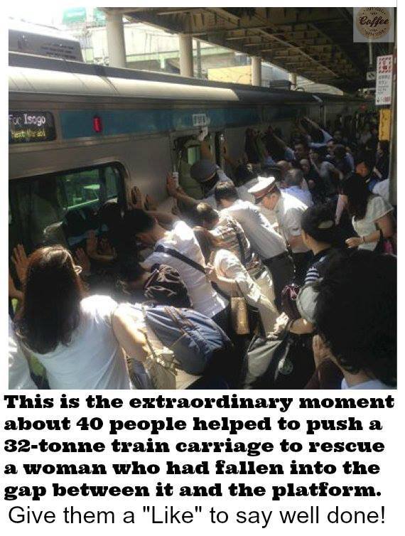 Japánban egy asszony beesett a peronról, és valamennyi ott tartózkodó segített neki. 32 tonnás vonatot mozdított meg 40 ember a szabadulásához.