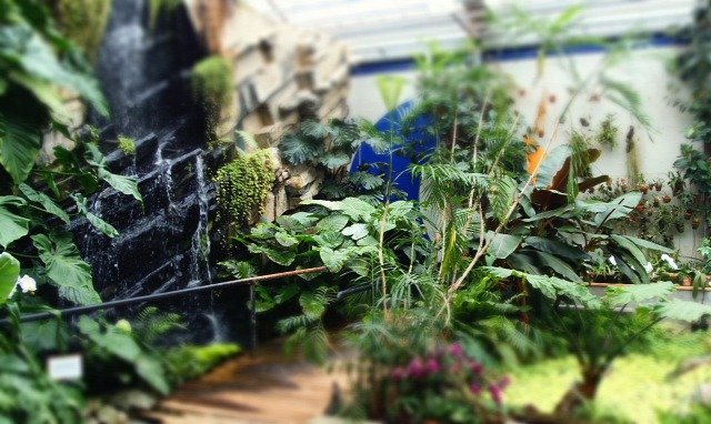 A teljes üvegház komplexum hőmérsékletét és a levegő páratartalmát számítógépek felügyelik, és biztosítják az előírt, megfelelő körülményeket a növényeknek. Ha kell, meleg vizet keringtetnek, ha kell szellőztetnek, ha kell megnyitják a tető alatti vízporlasztó csapokat. Ez a trópusi kertben is így működik, ezért időnként egy kis “esőben” is lehet részünk.