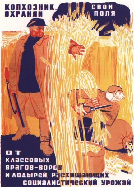 Haljak meg, rendesen beparázok az ilyen típusú vadorzó fejű ábrázolásoktól. Itt azt ecsetelik éppen, hogy a “Kollektív gazda – megvédi a mezőket az osztály ellenségektől: a tolvajoktól és naplopóktól, akik ki akarják zsákmányolni a szocialista aratást!”