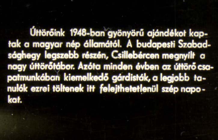 A tábor hétköznapjairól egy 1955-ben készült diafilm is megtekinthető itt, melyből részleteket láthattál.