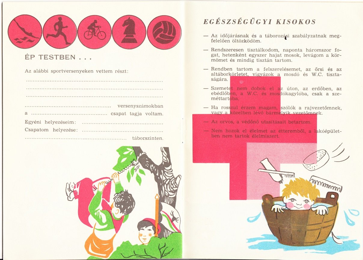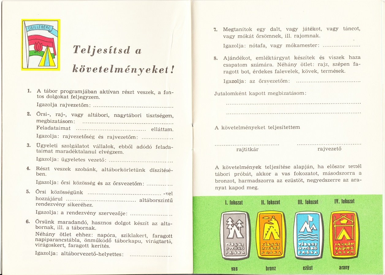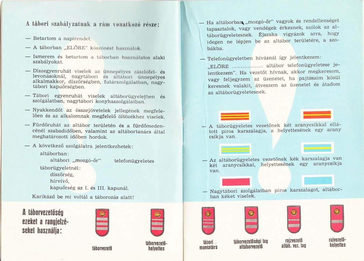 A táborozás azonban nem csak mókából és kacagásból állt, az úttörőknek komoly napirendje és kötelezettségei is voltak, amelyeket a táborba lépéskor kapott Együtt-Egymásért! (nem, nem az alapítvány) című füzetkében találhatott meg.