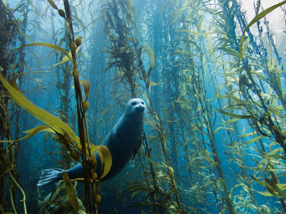 Foltos kis fóka úszik át a hínáron – San Diego, Kalifornia