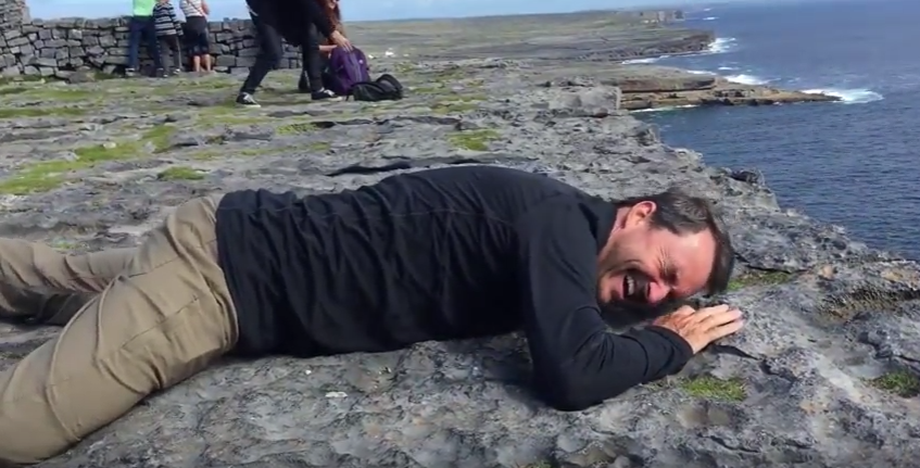 Az írországi Dún Aonghasánál döntött úgy, hogy hasra veti magát, valahogy, laposkúszásban megközelíti a peremet. Az Atlanti-óceánt onnan nézni, ritka csodás élmény. A férfi – talán, hogy fiának is tanítson valamit a félelmek legyőzéséről – minden erejét bevetve, centiről-centire verekedte előre magát, hogy lepillanthasson a peremről az óceánra.